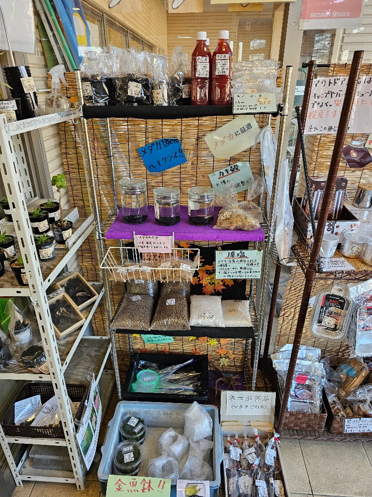 1月13日、メダカ、水草、飼育用品多種、インテリア用飾り炭多種、アウトドア用品多種、販売中です。